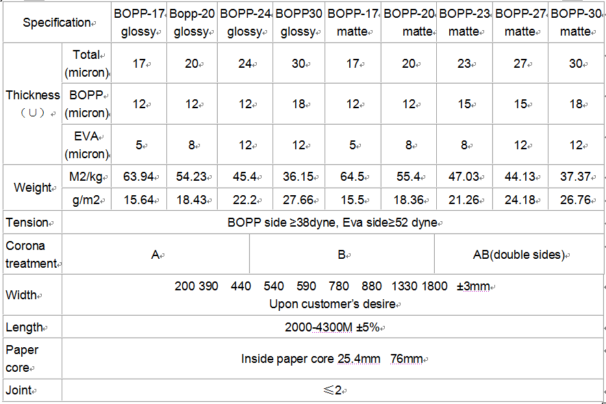 BOPP thermal lamination film specifications thickness:17-27 width:200-1800mm length: 2000-4500m lead time: 7-25 days MOQ: 1000-2000 KGS customization: customized logo customized packaging